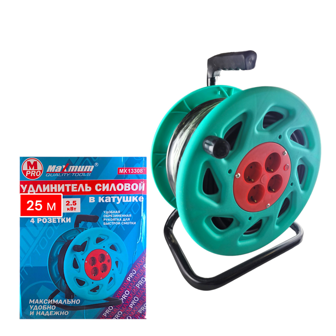 Удлинитель силовой 25 метров на ПВС катушке с кабелем КГ сечением 2х2,5 мм² от "Maximum Quality Tools" оборудован одной выносной EURO розеткой. Силовой удлинитель с заземлением на 220 Вт предназначен для временного подключения объектов как внутри помещений, так и на улице. Длина кабеля 25 метров, он выполнен на прочной катушке из пластика с металлической усиленной стойкой.