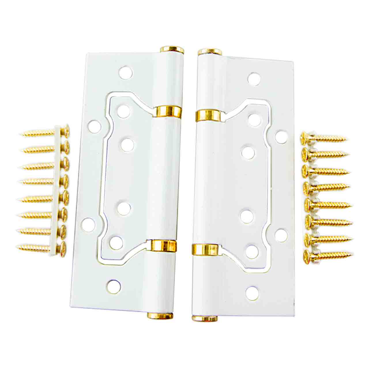 Накладные петли состоят из двух неразъемных частей (карт). Одно полотно петли накладывается на торцевой стороне двери, другое полотно накладывается к дверной коробке. Белые накладные петли не требуют врезки, установка таких петель не трудоемка и не требует специальных навыков и оборудования. Стальные петли толщиной 2 мм и покрыты эмалью и лаком белого цвета.
